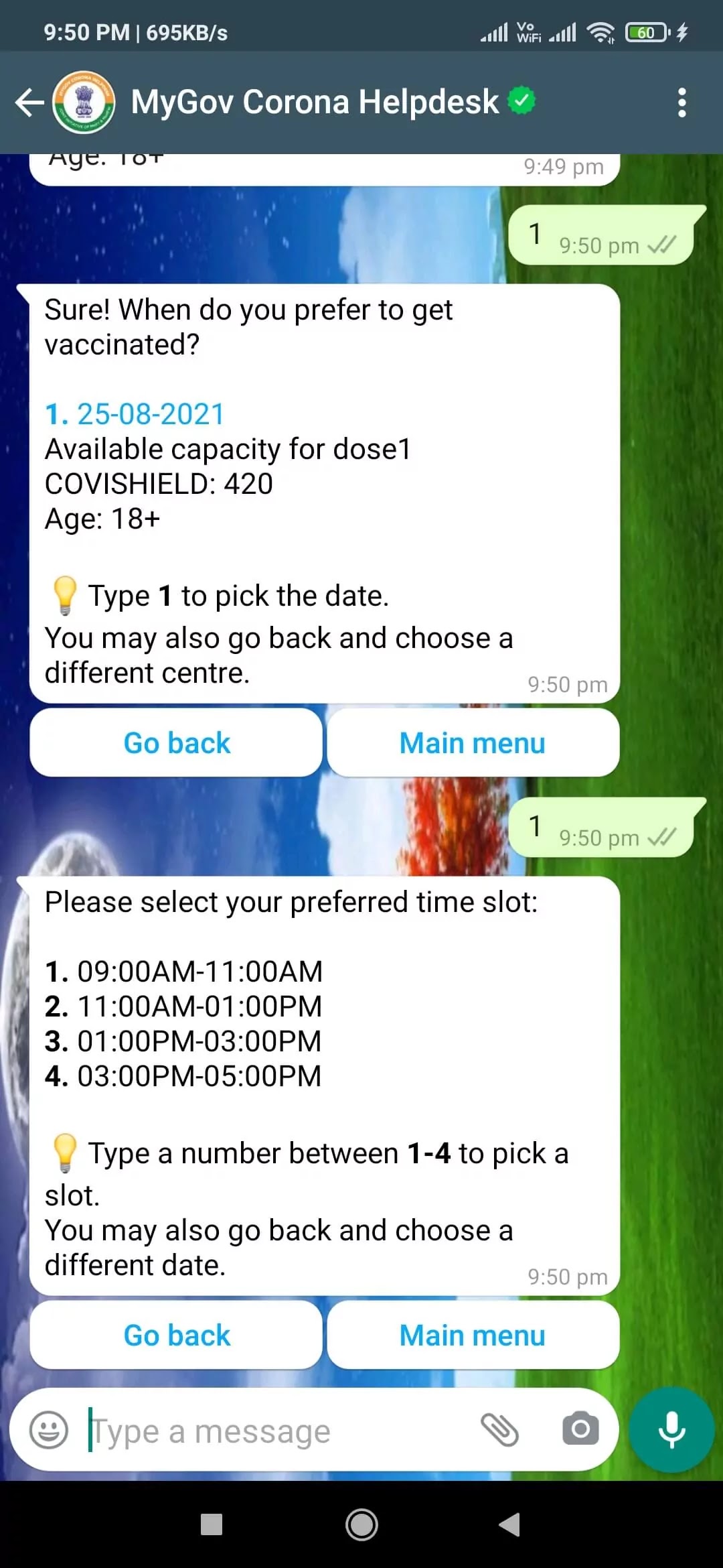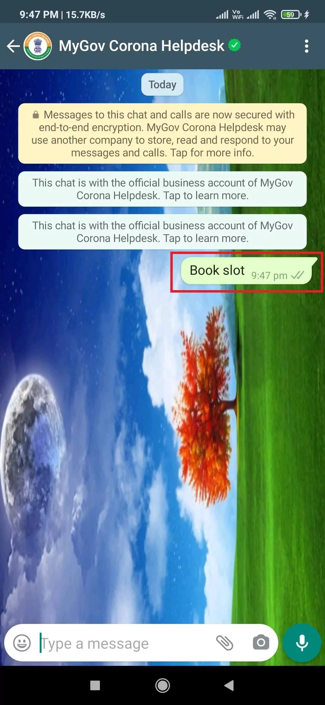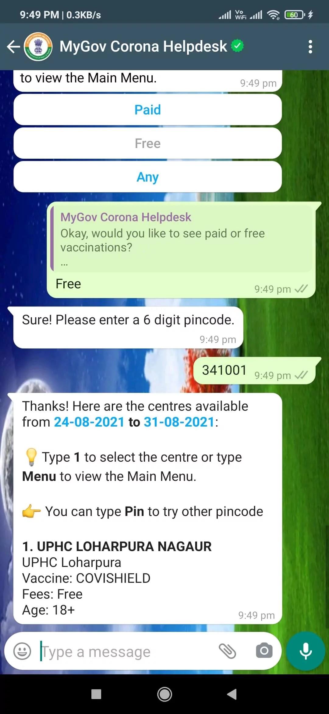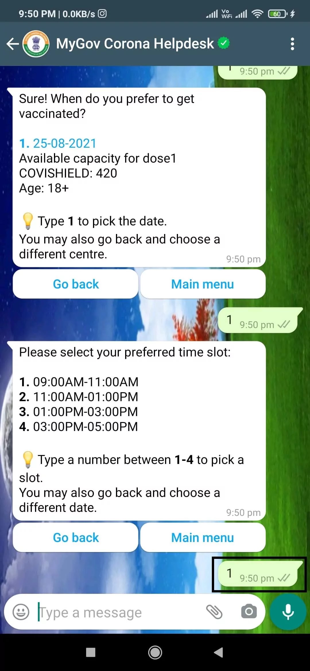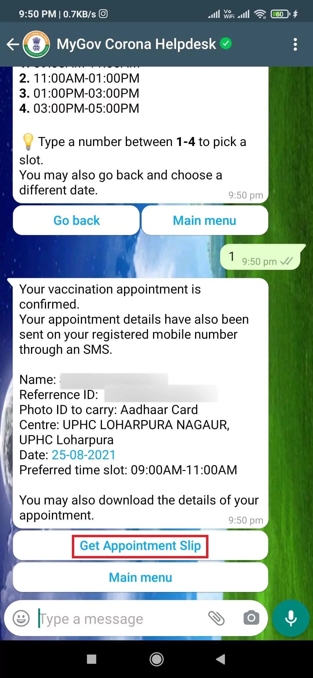 - जब हम गेट अप्वाइंटमेंट स्लिप को सेलेक्ट करेंगे तो व्हाट्सएप के द्वारा हमें हमारे कोविड-19 वैक्सीनेशन की स्लिप भेज दी जाएगी|