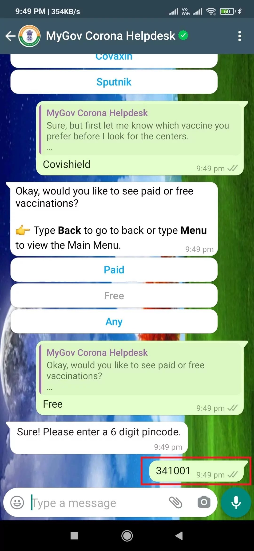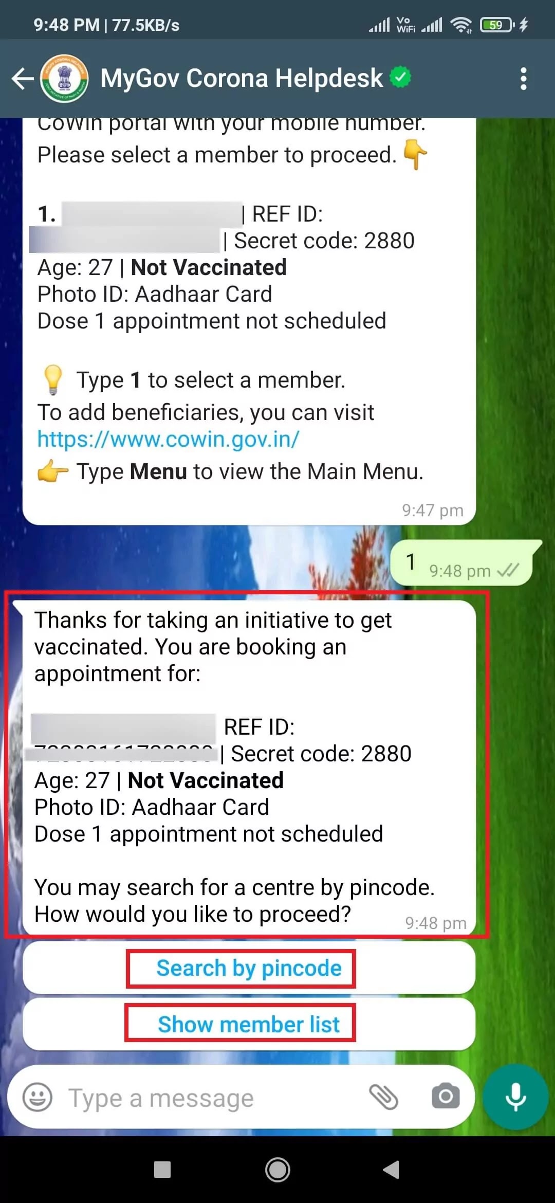 - आपको जो सदस्य डिटेल में दिए गए हैं उनमें से जिसके भी वैक्सीन लगवानी है, उसके आगे दिया नंबर वापस मैसेज कर देना है|