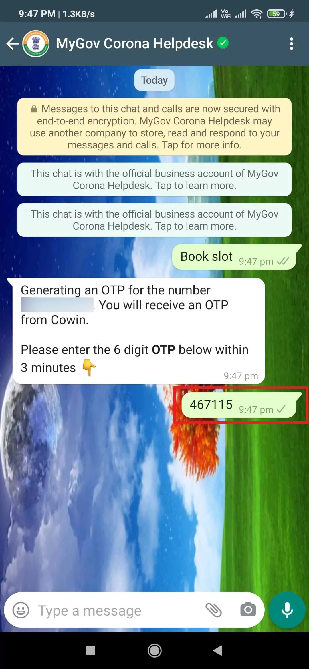 - आपके पास रिप्लाई के रूप में एक मैसेज आएगा जिसमें लिखा होगा कि आपके मोबाइल पर ओटीपी भेजा गया है|